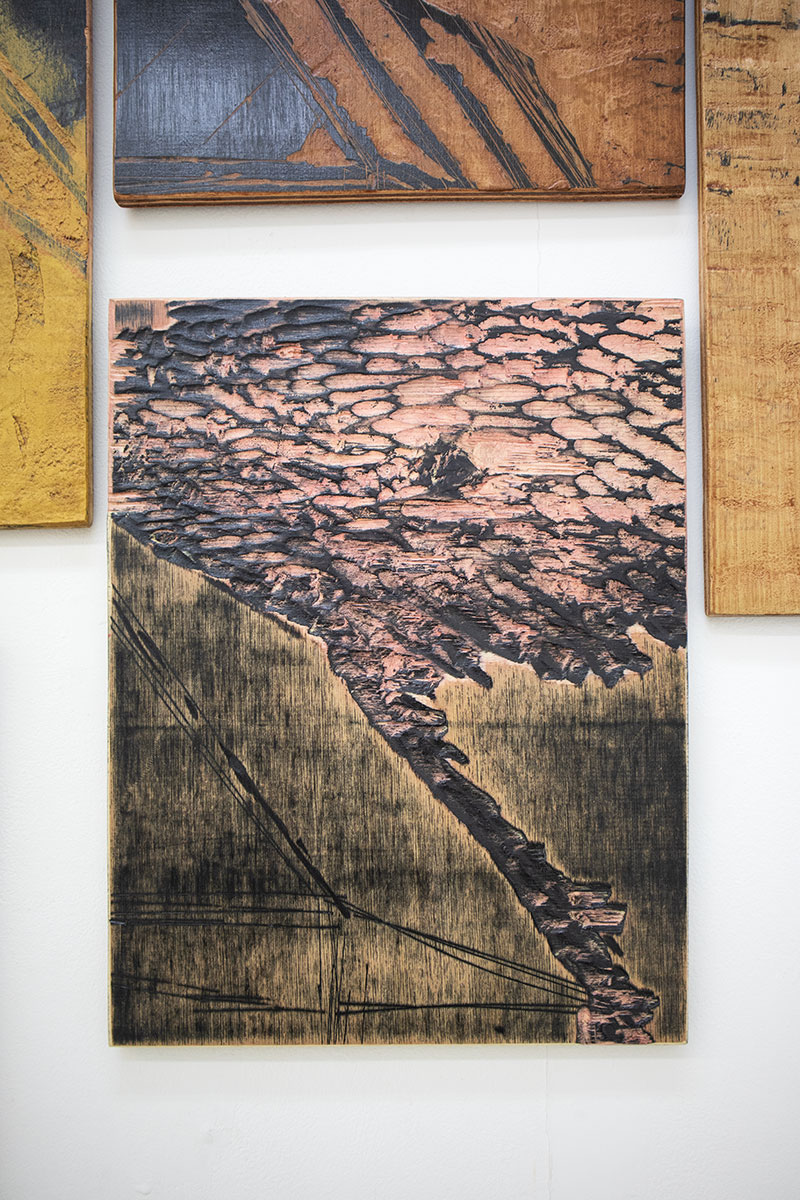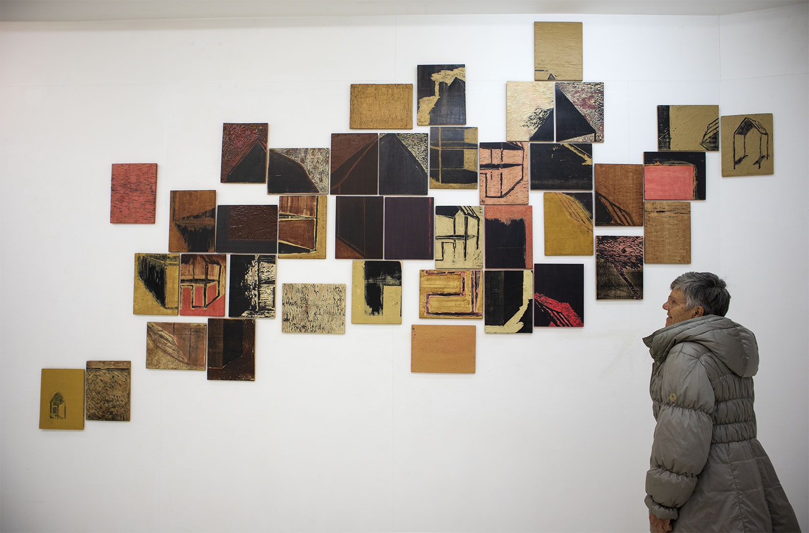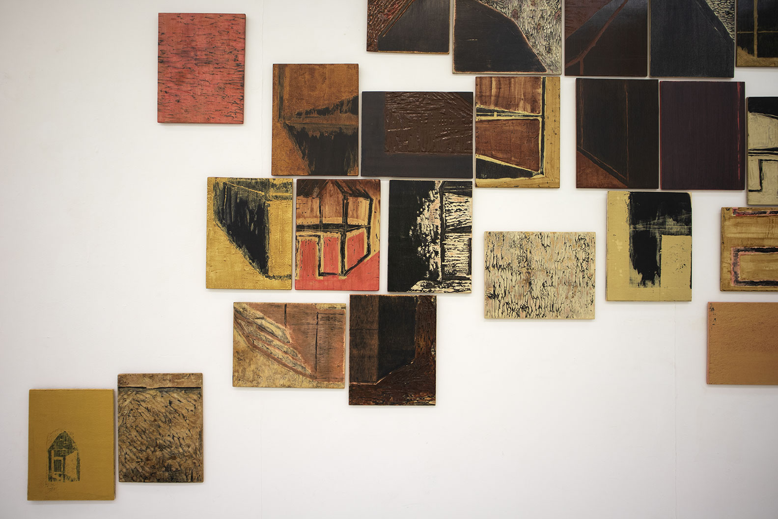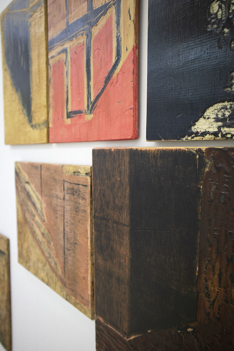 The piece consists of waste materials: engraved wood plates that were used as matrices for the series of prints entitled Maisons [Houses]. These forms, initially designed to leave marks on the paper, are cut up, clogged with a coating, varnished and rearranged. Through these transformations, displaying a step backwards or impossible repairing, this remnant takes on visual autonomy.